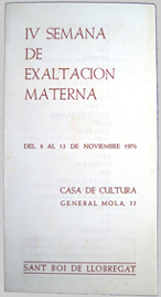 From the 8 to the 13 of November of 1976 it was predicted to make IV the Week of Maternal Exaltation in the locality of Sant Boi de Llobregat, with the subvention of the Municipal Commission of Culture of the City council of Sant Boi de Ll. and Exma. Provincial delegation of Barcelona. Also "La Caja de Pensiones para la Vejez y de Ahorros" collaborated. Day 8 of November of 1976, the first day in which had to take part the lawyer Doña Consuelo Goñi de Desojo with the titled conference "Right of the Woman", arrived a letter from the Civil Government who prohibited the celebration of the acts. The artist Leopold Altés i Molins of the Güell Colony donates a work, titled "Vetllar el fill" to illustrate the posters for the next maternal week. |